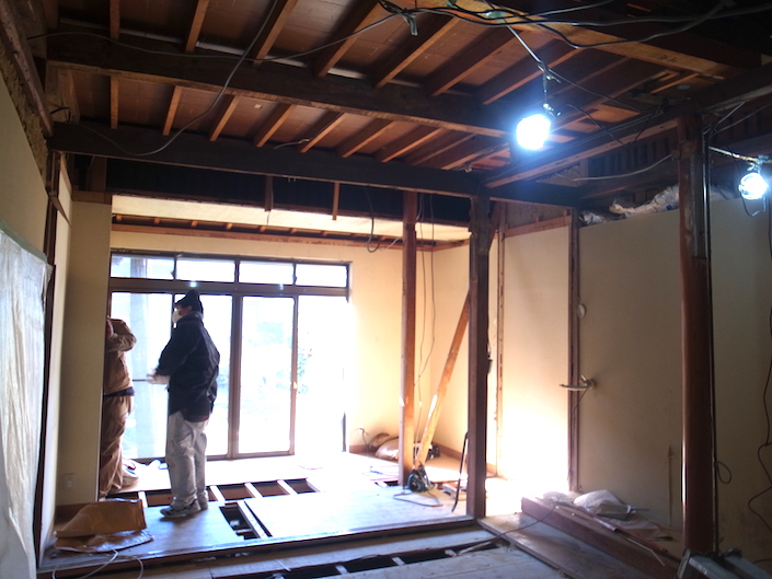 工事風景。床板も剥がし、土の上に配筋のあるベタ基礎を打ち脆弱な現状を改良。